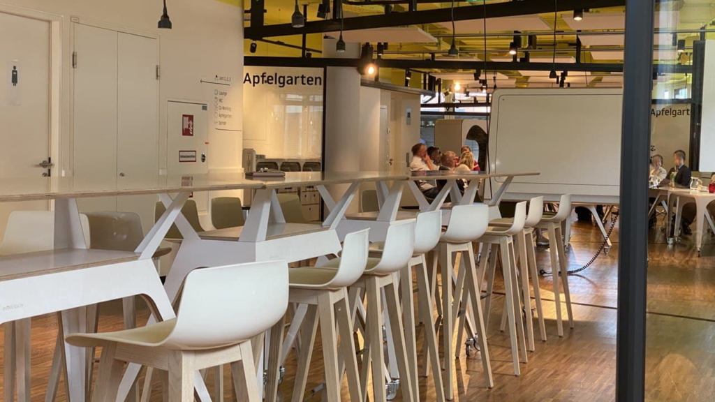im wiener orbi tower wurde ein ganzes stockwerk auf 450 m² in den ultimativen creative space umgebaut. ziel war es, alles 100 % flexibel nutzbar und nach herzenslust umbau- und kombinierbar zu machen. ein dreh- und höhenverstellbarer 98″ monitor auf einer selbst entwickelten, im boden verschraubten säule begrenzt den großen vortrags- und pitchbereich. dazu kommen die jamsession digitalboards mit videokonferenzausstattung sowie mobile ladetrolleys, um auch im letzten winkel sein ipad laden zu können. natürlich dürfen 3d drucker nicht fehlen.